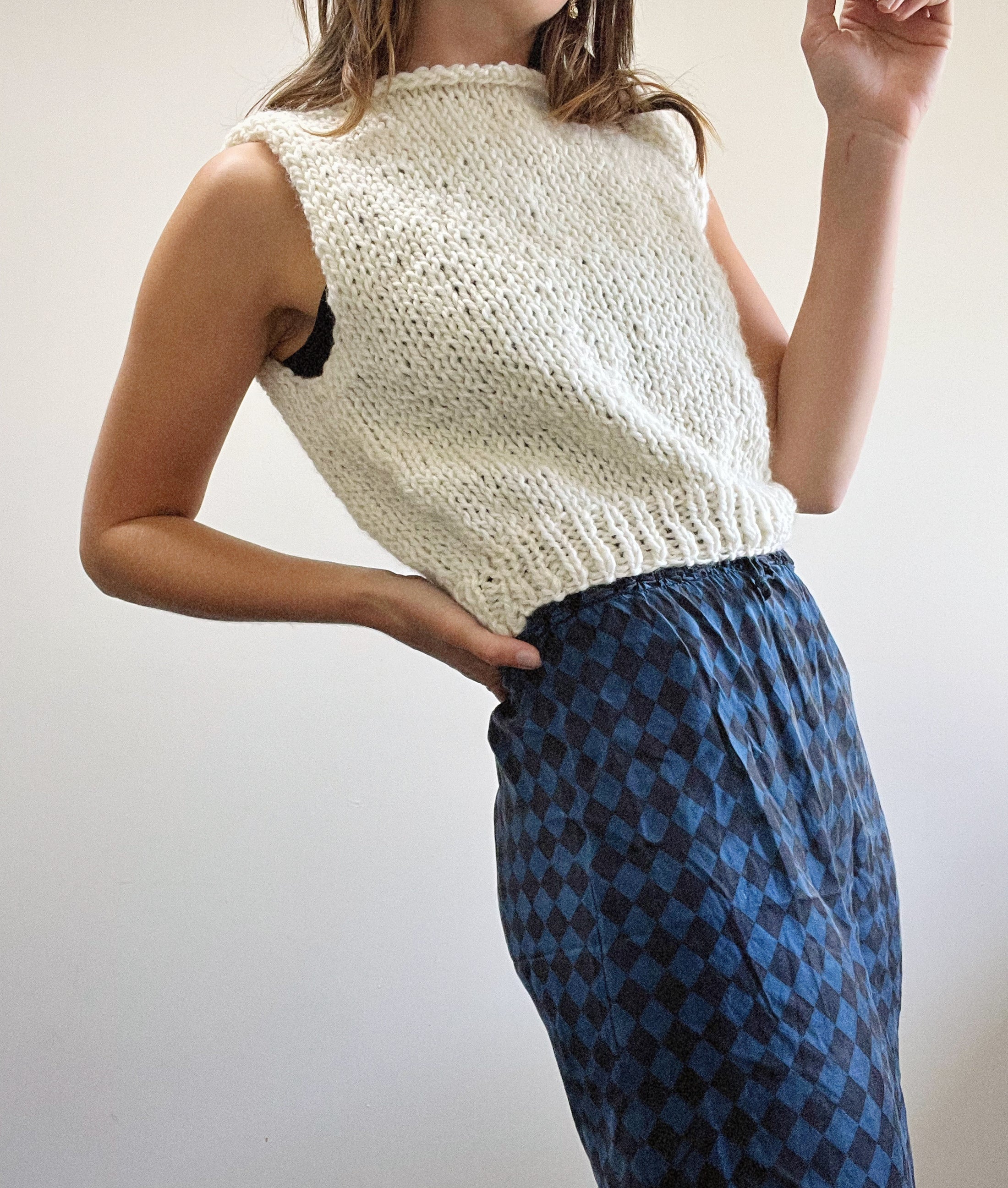 Monday Journal Knitting Pattern. The perfect beginner's pattern if you are new to knitting and don't know where to start. This knitting pattern includes a PDF download for sizes XS-XL of the vest in the product pictures. Pictured also on an S for reference.