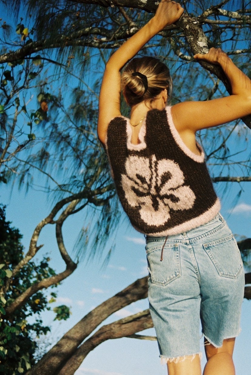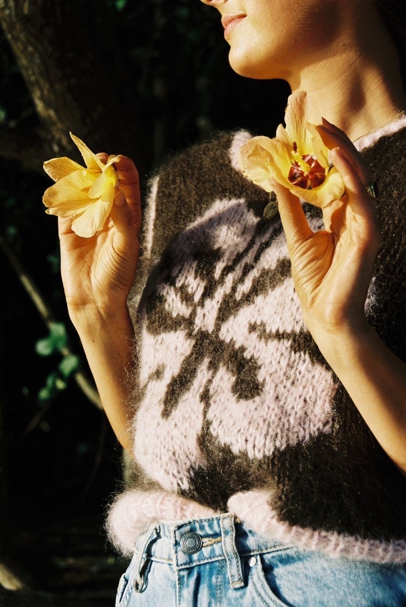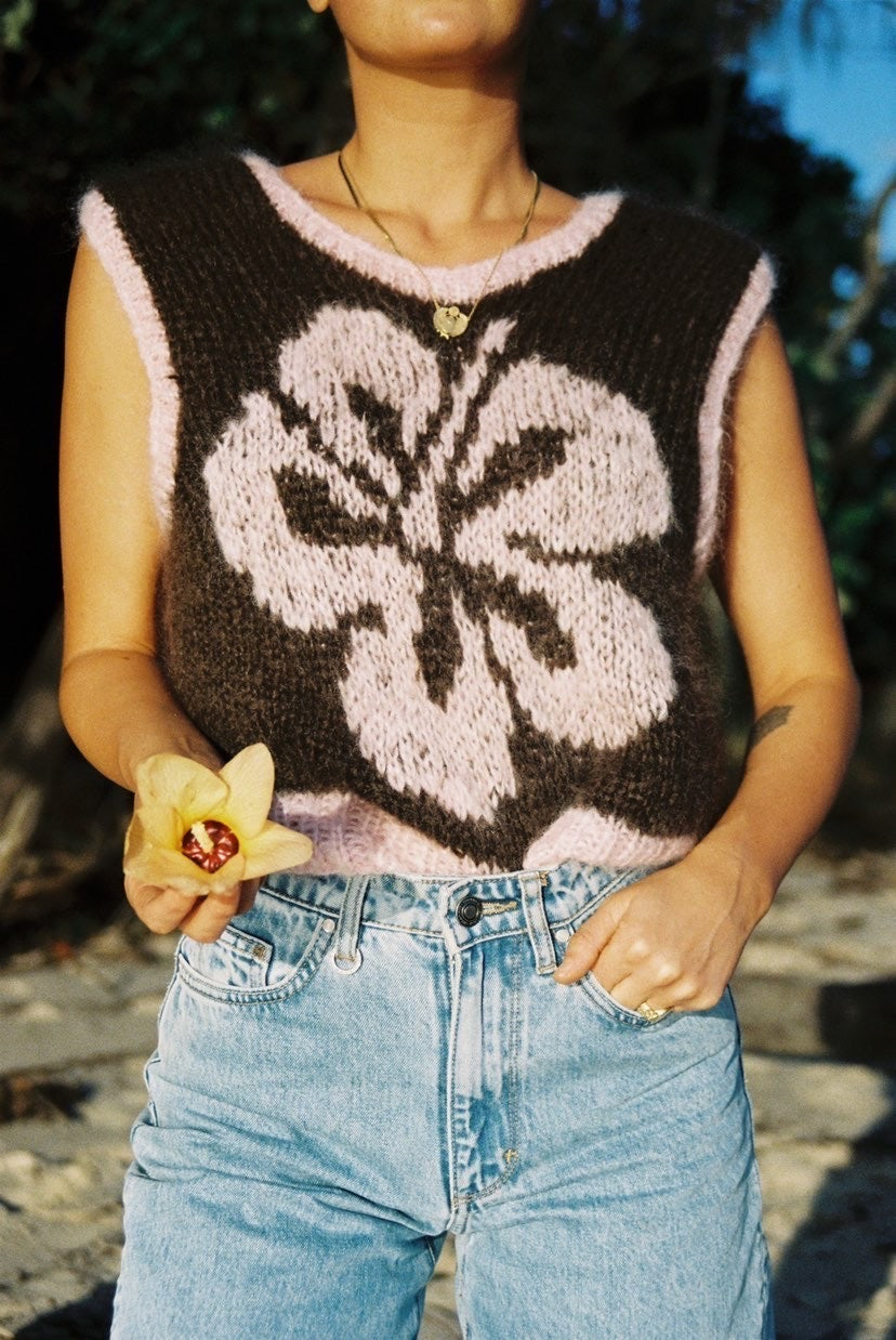 Monday Journal intermediate floral sweater vest knitting pattern! This pattern is to make your very own floral patterned flower vest using the dreamiest, softest mohair yarn. This knitting pattern includes a PDF download for three sizes XS/S-M/L-XL.