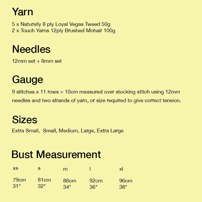 5 x Loyal Vegas Tweed + 2 x 12ply Touch Yarns Mohair. For bust sizes see last image.