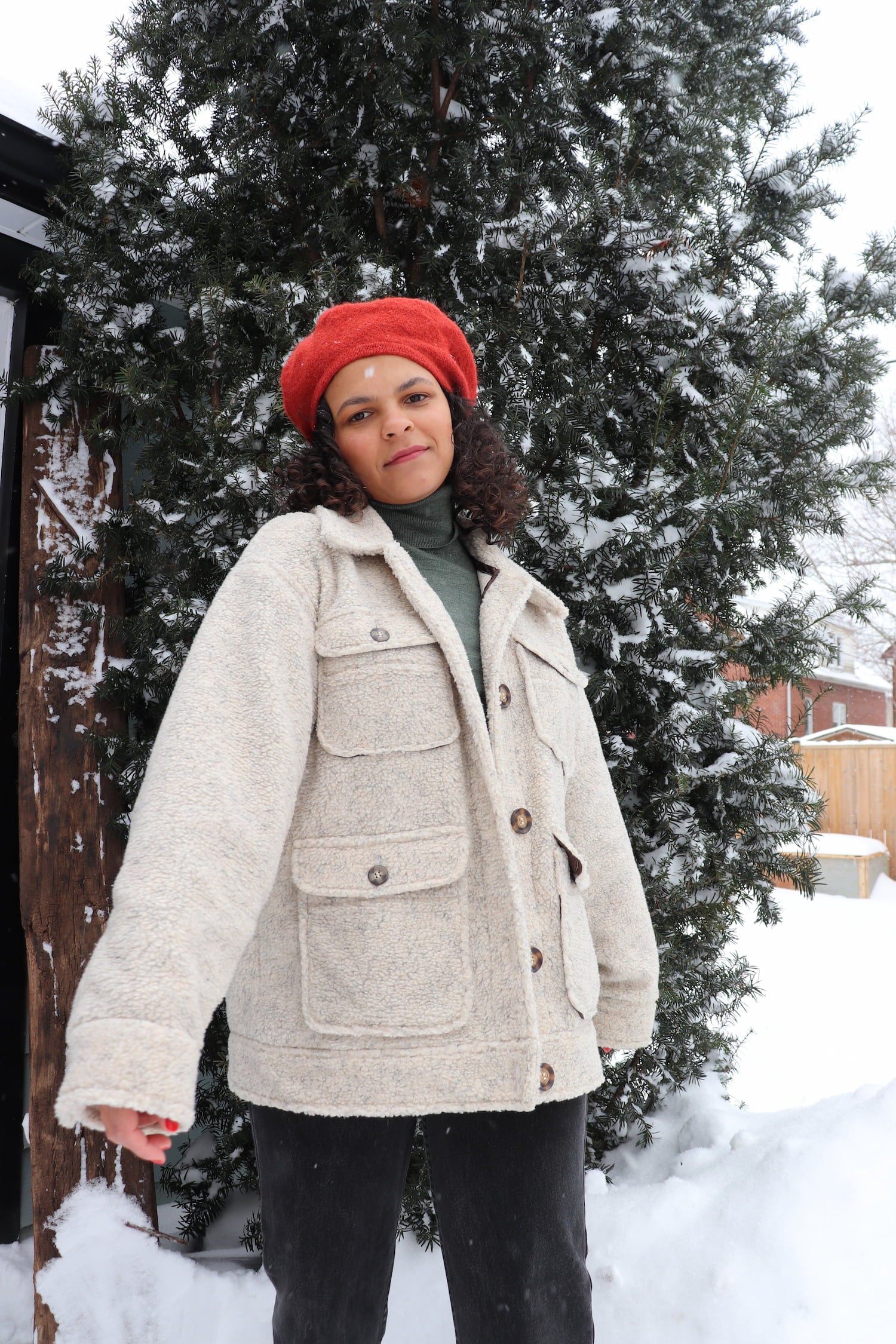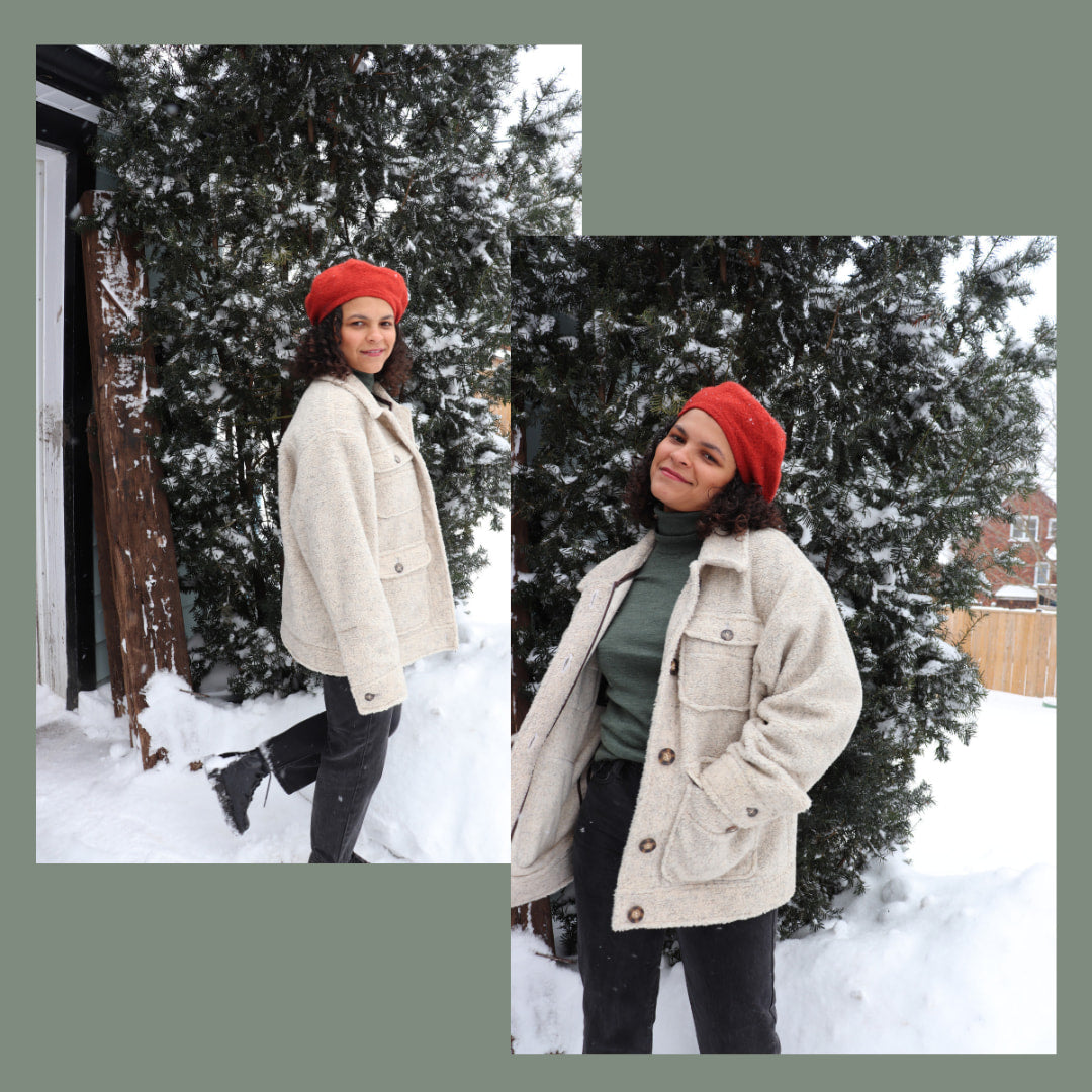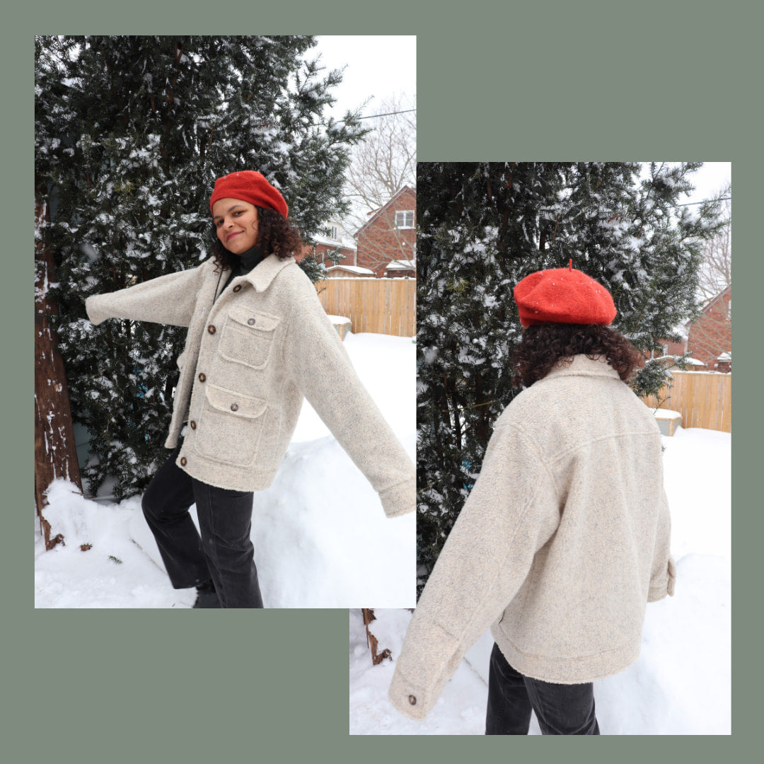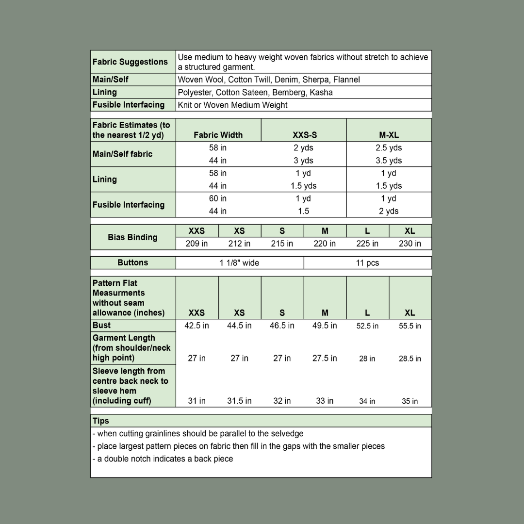 An oversized, comfy and yet chic, fall/winter/spring utility jacket. This jacket features a buttoned front, convertible collar, four patch pockets, a back yoke, and vented sleeves. The sleeves are lined while the rest of the internal seams can either be overlocked or bias bound.
