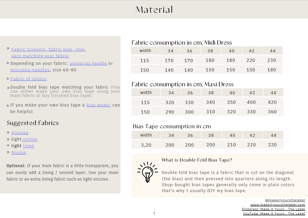 Fabric of your choice, thread matching the colour of your fabric, fabric scissors / rotary cutter, fabric pins, and an iron. Matching bias tape (double folded). You can either make the bias tape yourself from your main fabric or buy ready-made bias tape. Featured is 3 cm wide bias tape, optionally you can use wider or narrower bias tape. Optional: a bias tape former.