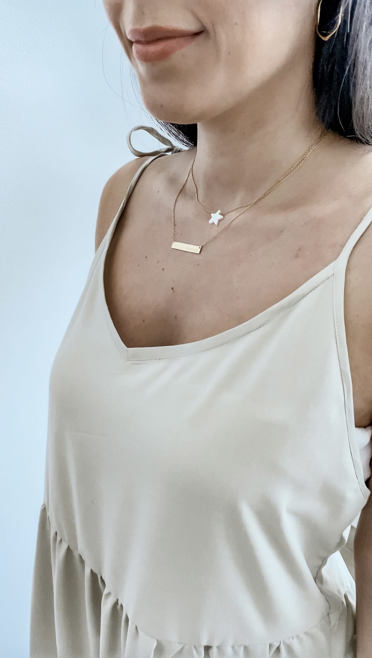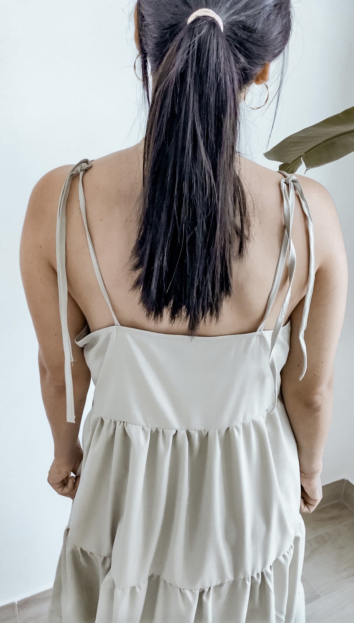 A ruffle dress with with playful straps in two lengths, slightly oversized and tie up straps.
