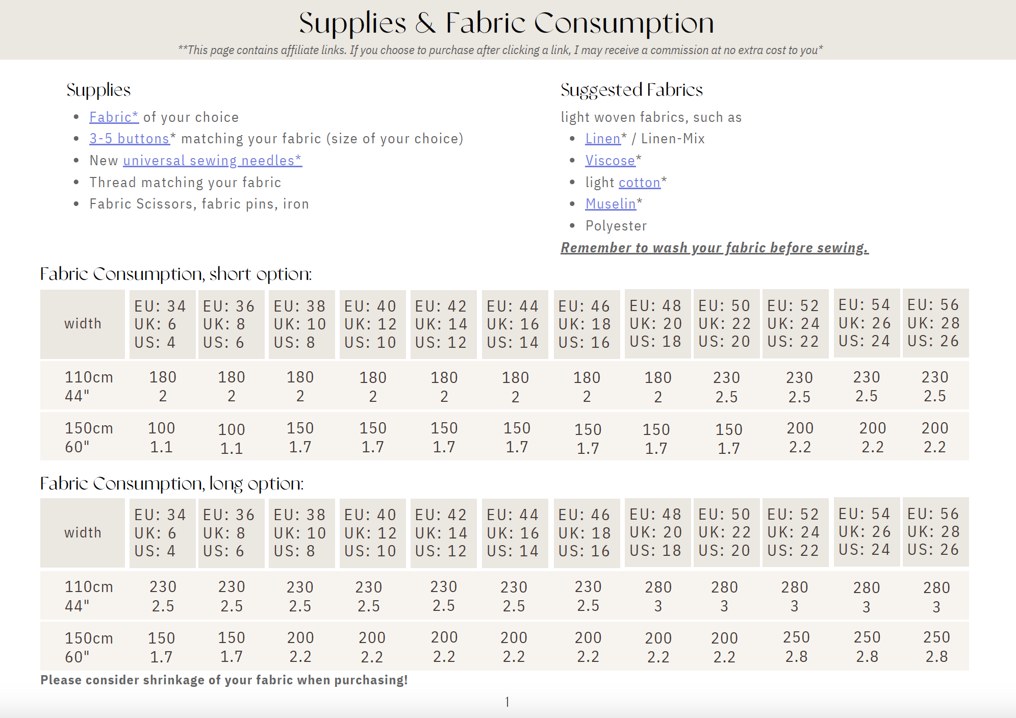 Main fabric, matching thread, 3-5 buttons (in the size of your choice), and 50cm fusible interlining.