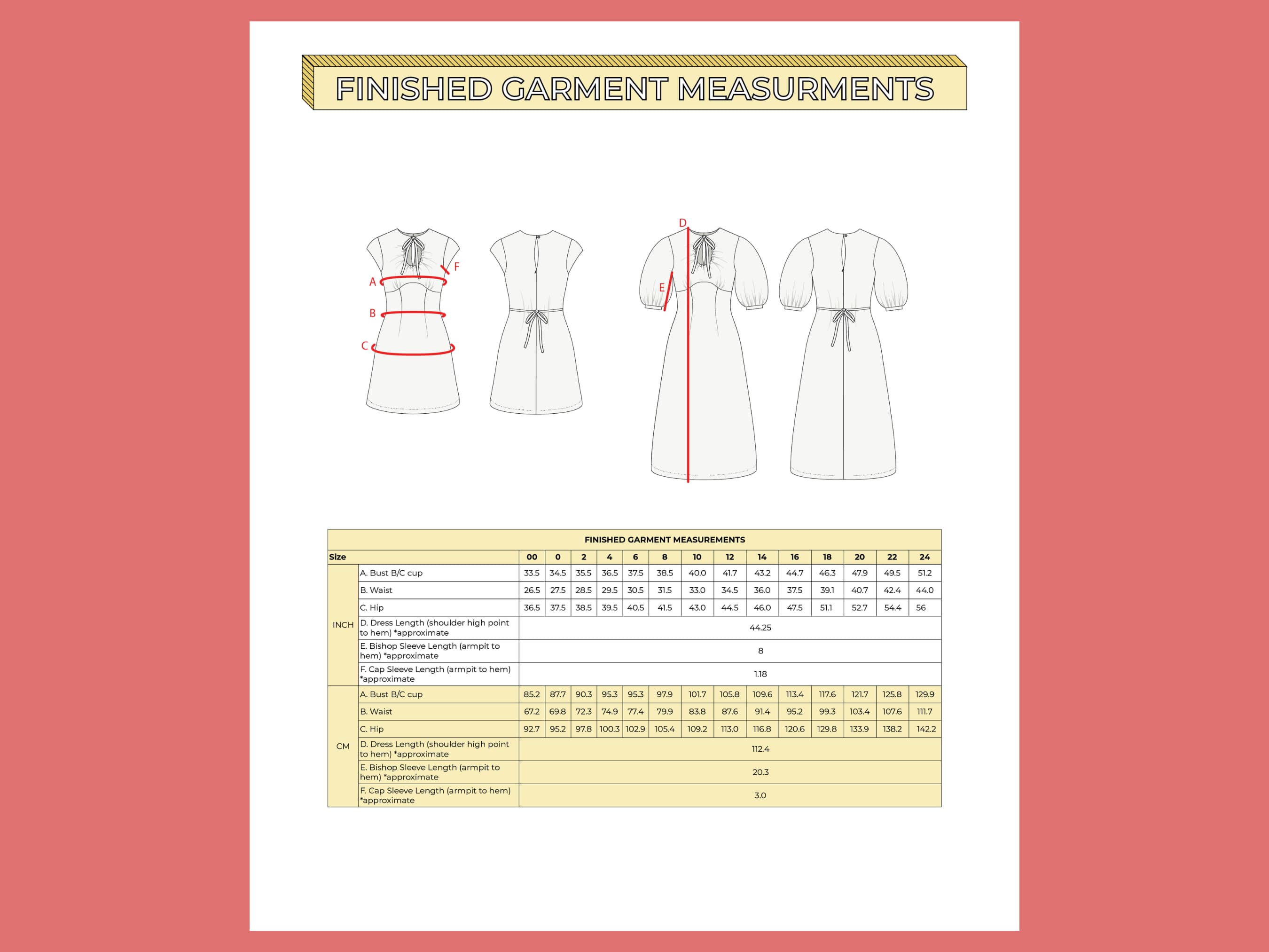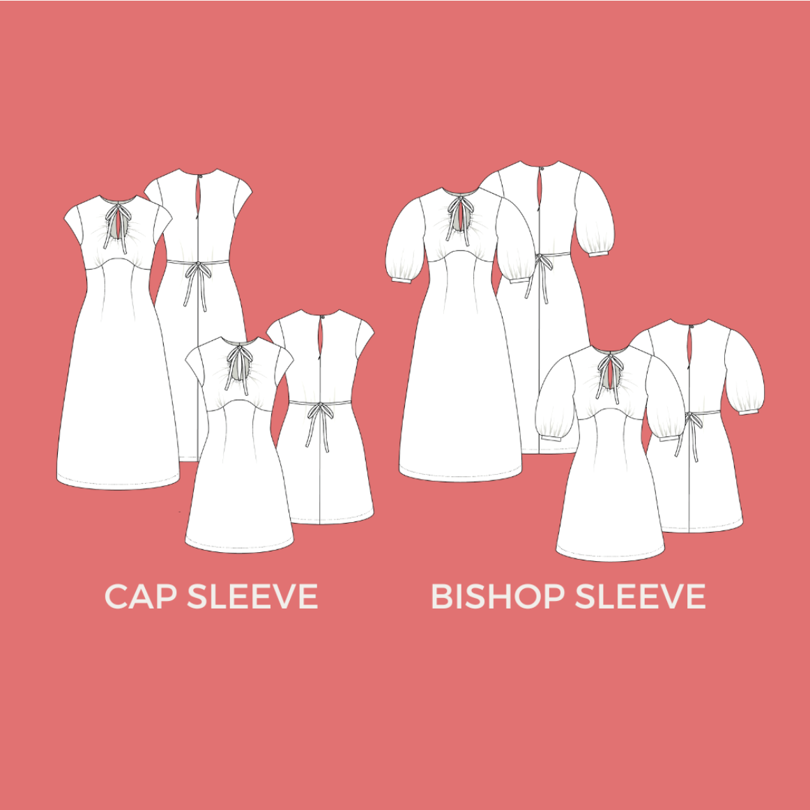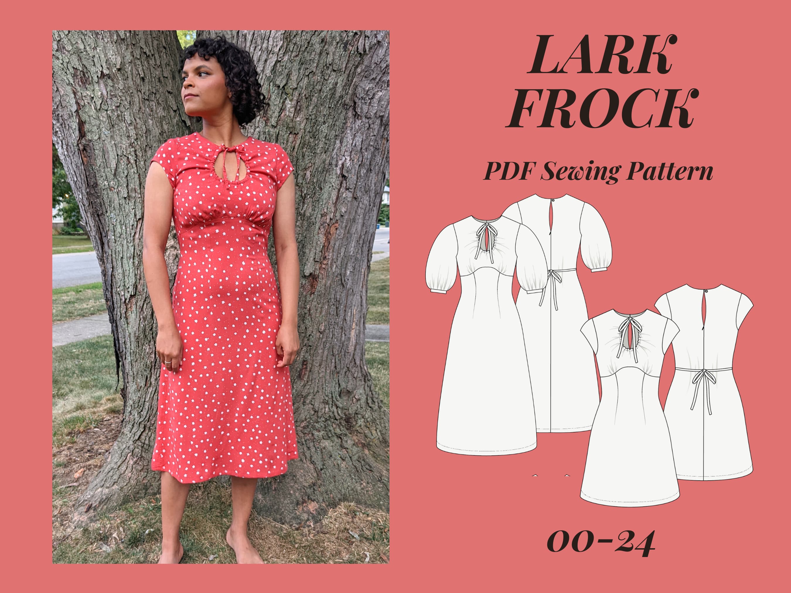 The Lark Frock features a front bodice drawstring keyhole and a gently gathered curved bust line. It has a slim A-line skirt with room in the back for comfort and waist ties to cinch your waist if desired. The back also features a buttoned keyhole at the neck and there is an optional dart if you want a cinched back waist. You can decide between a bishop 3/4 sleeve or cap sleeve. The pattern includes both a calf length and an above-the-knee length. And to make this all season appropriate there are instructions for how to make a full length bishop and fitted sleeve in the Read-First file.