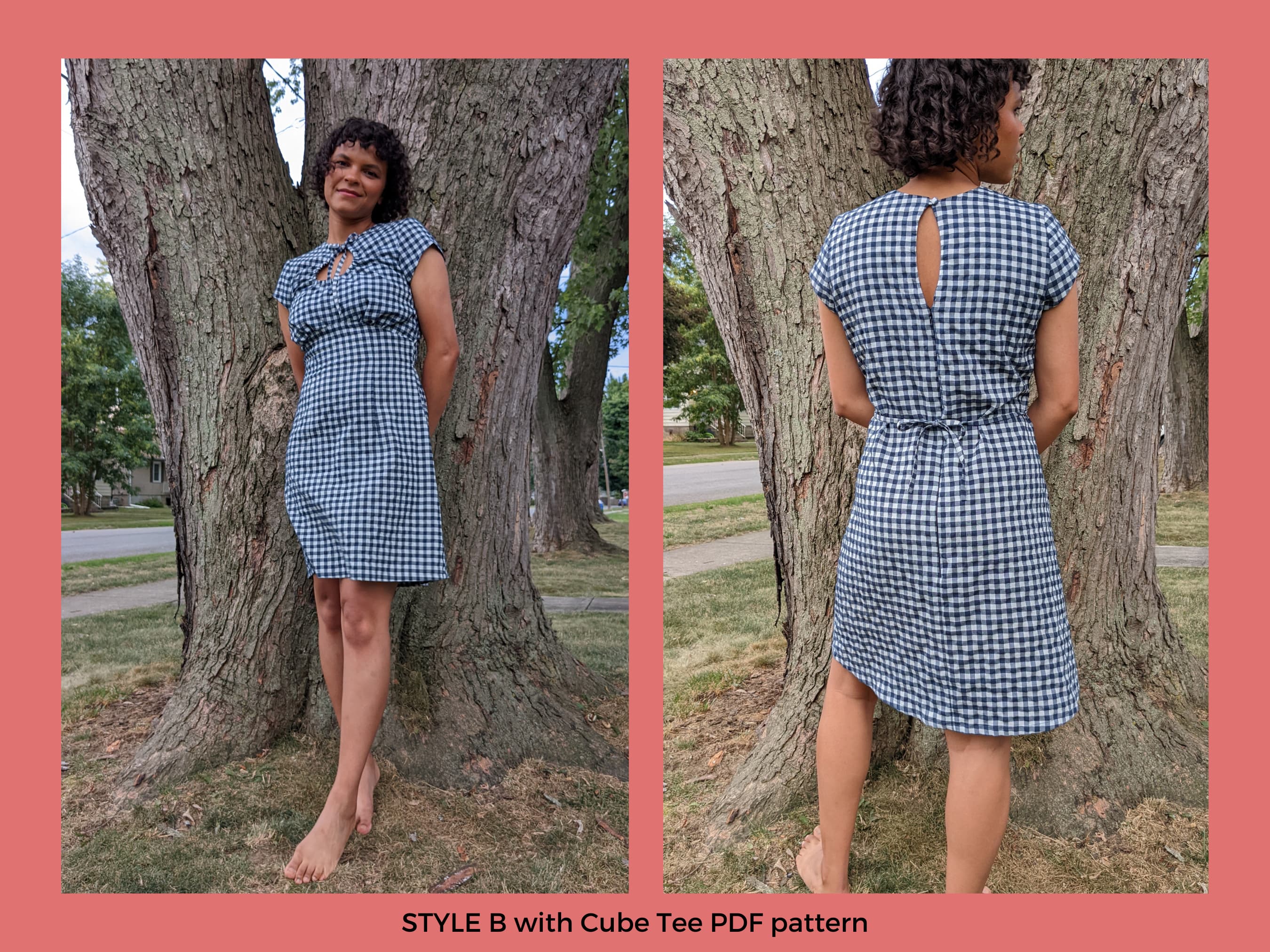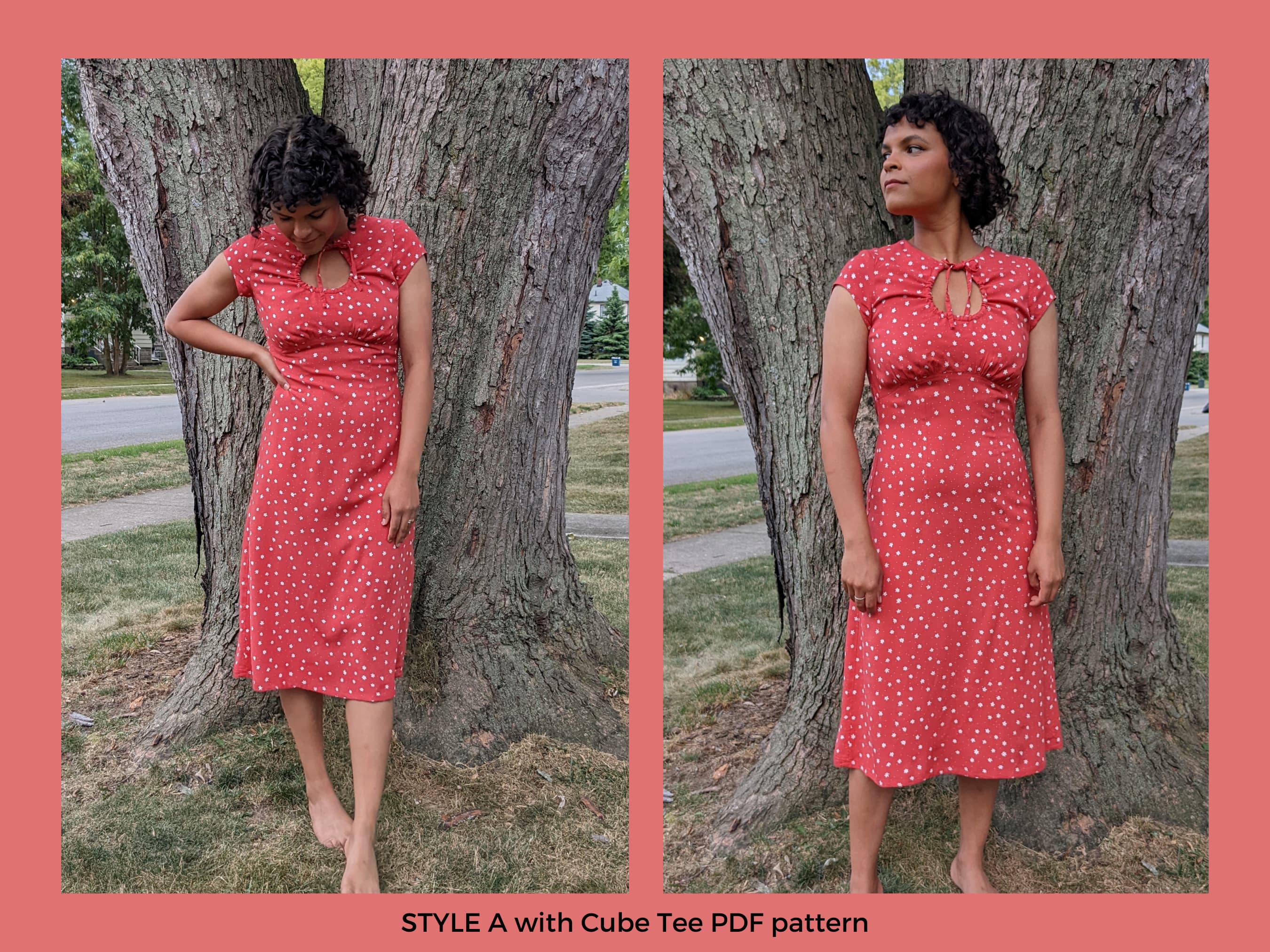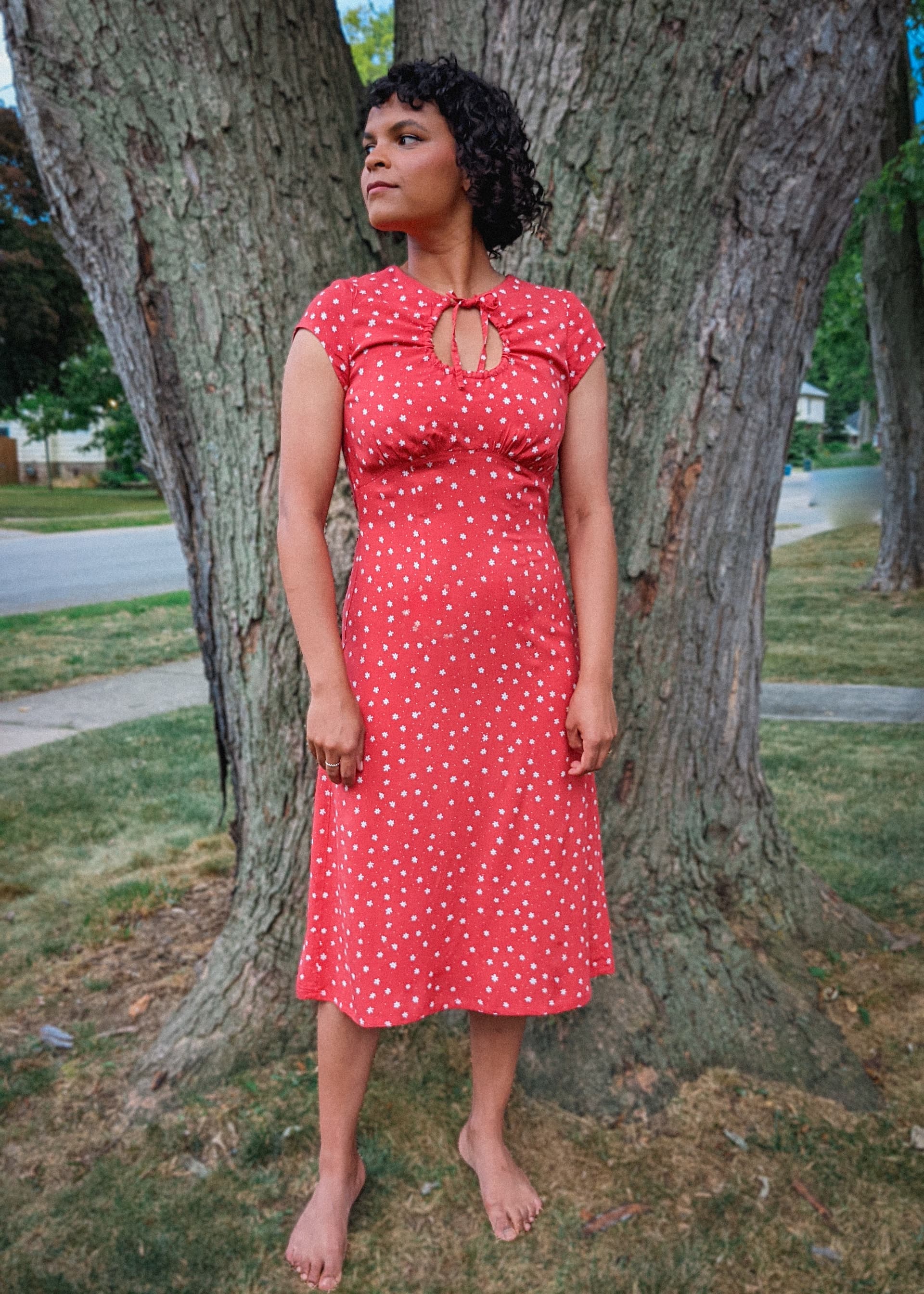 The Lark Frock features a front bodice drawstring keyhole and a gently gathered curved bust line. It has a slim A-line skirt with room in the back for comfort and waist ties to cinch your waist if desired. The back also features a buttoned keyhole at the neck and there is an optional dart if you want a cinched back waist. You can decide between a bishop 3/4 sleeve or cap sleeve. The pattern includes both a calf length and an above-the-knee length. And to make this all season appropriate there are instructions for how to make a full length bishop and fitted sleeve in the Read-First file.