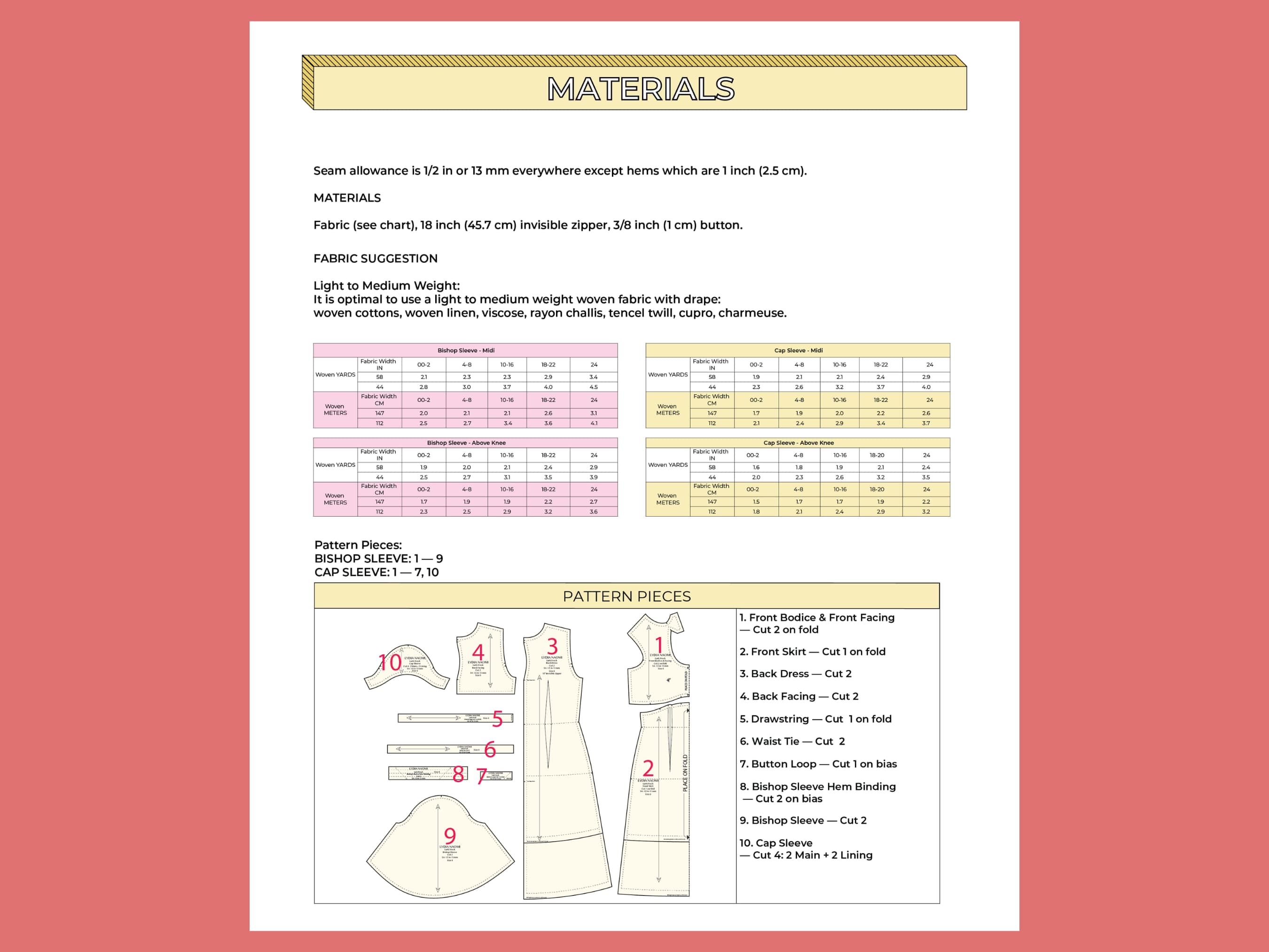 Fabric, matching thread, a safety pin, 18 inch (45cm) invisible zipper, 3/8 inch (1 cm) button, fabric scissors, pins and an iron.