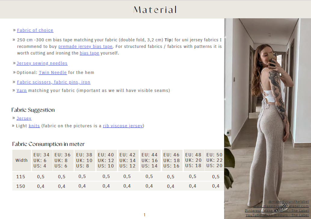 Fabric of choice, thread matching your fabric (important as it will have visible seams), 250 cm -300 cm bias tape matching your fabric, jersey sewing needles, fabric scissors, fabric pins and an iron. Optional: Twin needle for the hem.