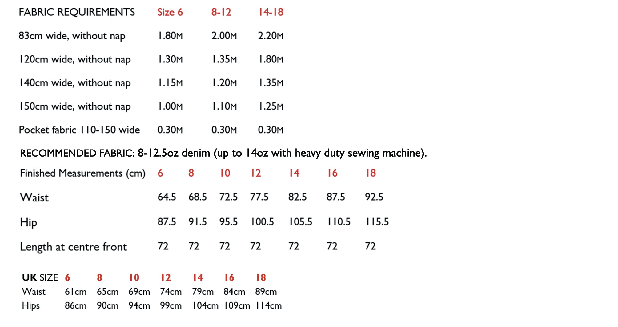 Woven fabrics; 8 - 12.5oz denim (or up to 14oz with a heavy duty sewing machine).