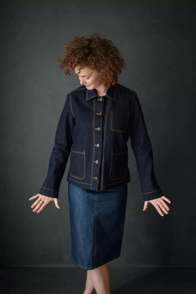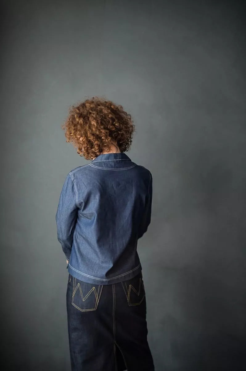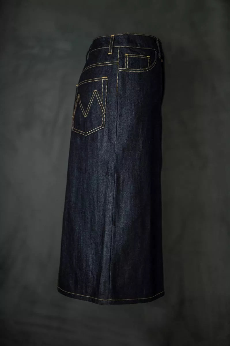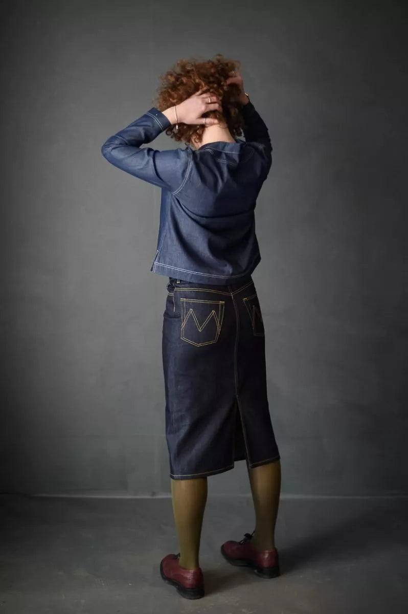 Slim fitting jeans skirt with a back split and shaped waist band. Merchant & Mills advises that a toile should be made first. Firstly to adjust the fit if needed but secondly to familiarise with the pattern instructions. This is not a traditional run and fell jeans seam, instead the seam is topstitched, which is easier to achieve on a domestic machine.