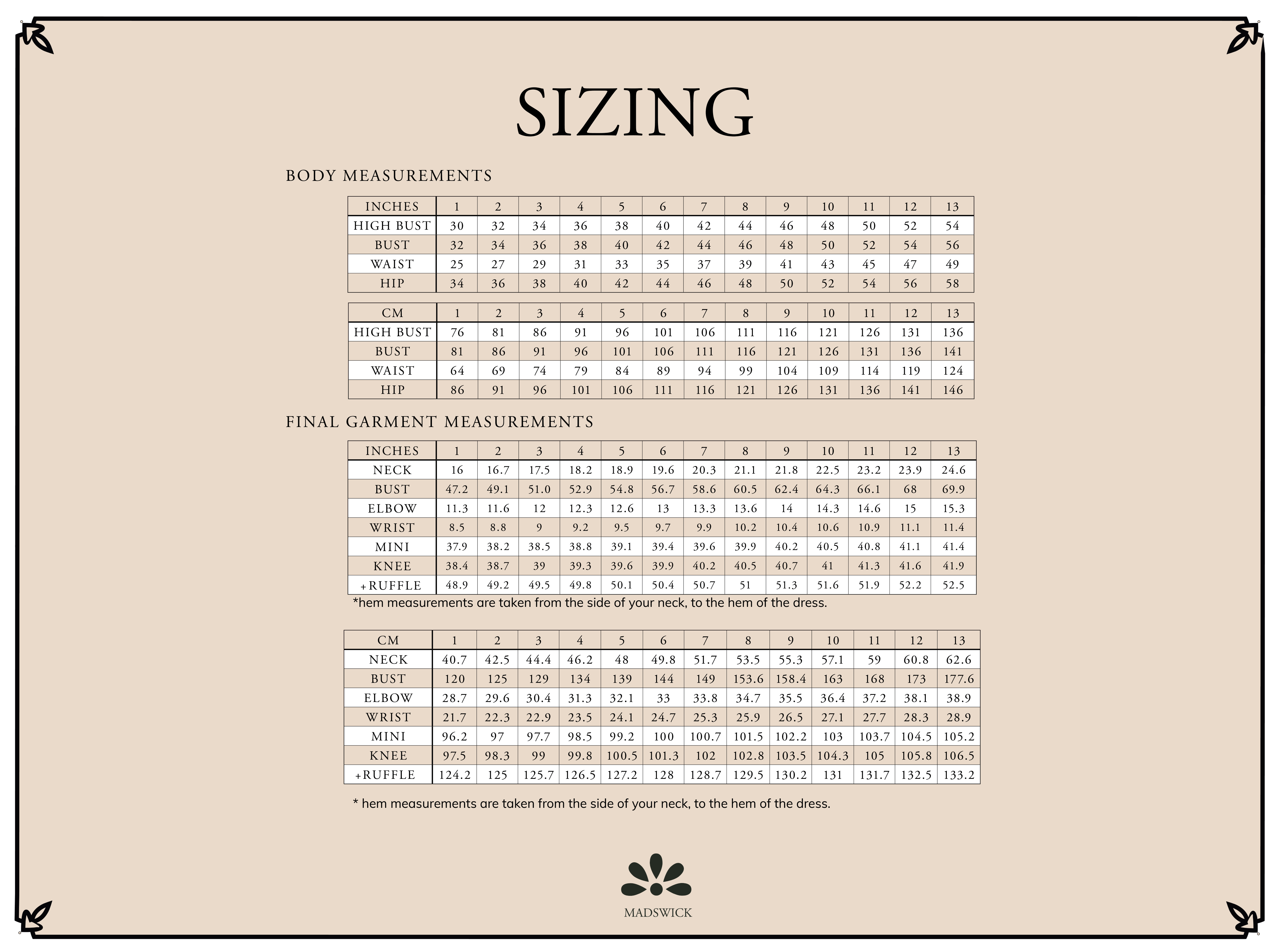 Size Range: The Raida Dress has 13 inclusive sizes with the bust measurement ranging from 32”-56” / 81-141cm.