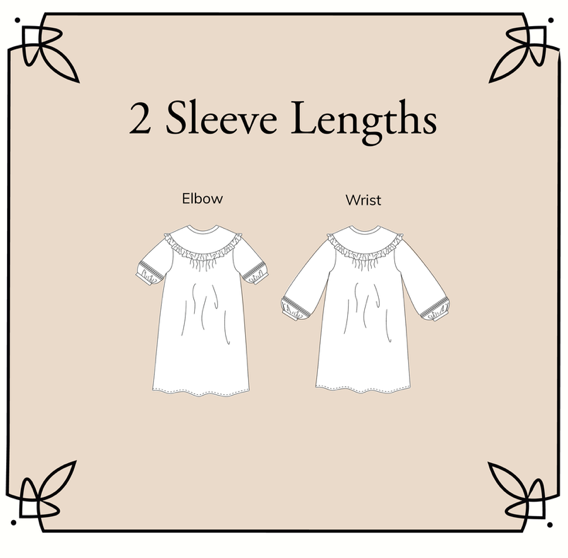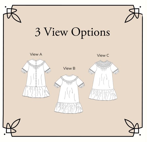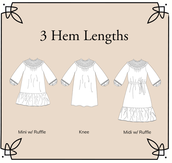 The Raida Dress has a circular yoke with a billowy bodice. The sleeves are designed to hit above the elbow or wrist, and feature 3 pin-tucks, gathers, and a binding hem. With 3 view options and 3 different hem lengths, there are numerous variations available with this pattern.